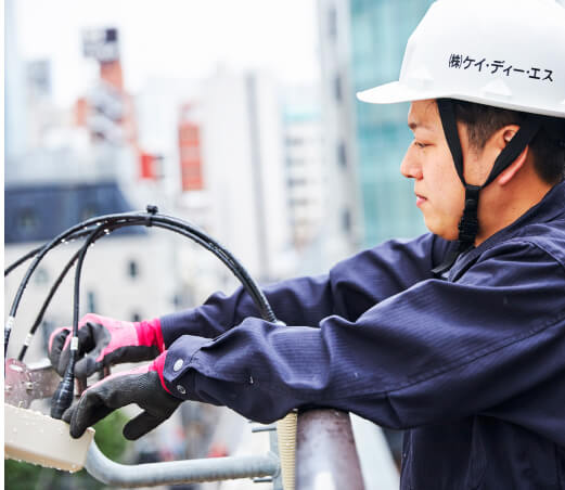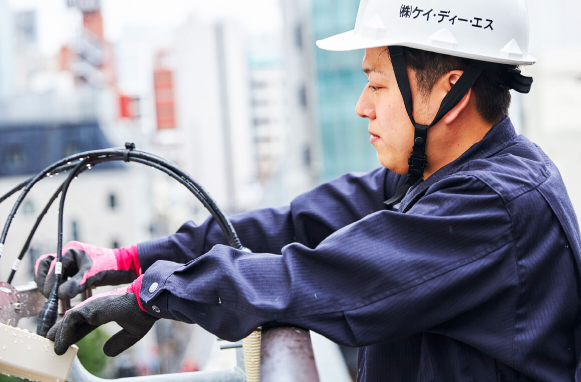 ネットワーク事業部の施工部隊を率いて、現場での施工を担当しています。KDSが主に手がけているのは、携帯基地局とLAN設備のふたつです。簡単な電気設備工事を手がけることもあります。オフィスビルや商業施設、病院、ホテルなどに向かい、注文を受けた設備を設置します。例えば基地局の工事であれば、電源の取得から配線、鋼材の組み立て、アンテナの取り付け、接続の確認まで、現場で必要とされる作業のすべてに対応しています。現場経験ゼロからの入社でしたが、自身で現場をまわせるまでになりました。