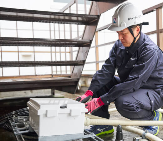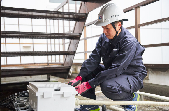 ネットワーク事業部の施工部隊を率いて、現場での施工を担当しています。KDSが主に手がけているのは、携帯基地局とLAN設備のふたつです。簡単な電気設備工事を手がけることもあります。オフィスビルや商業施設、病院、ホテルなどに向かい、注文を受けた設備を設置します。例えば基地局の工事であれば、電源の取得から配線、鋼材の組み立て、アンテナの取り付け、接続の確認まで、現場で必要とされる作業のすべてに対応しています。現場経験ゼロからの入社でしたが、自身で現場をまわせるまでになりました。